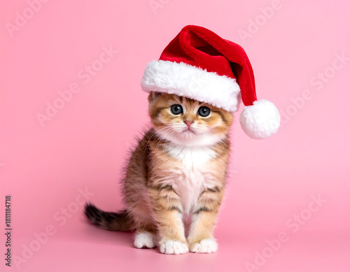Adorable Christmas Kitten in Santa Hat on Pink Background