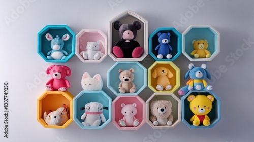 Adorable collection of colorful plush toys displayed in geometric shelves, perfect for a child's room decor
