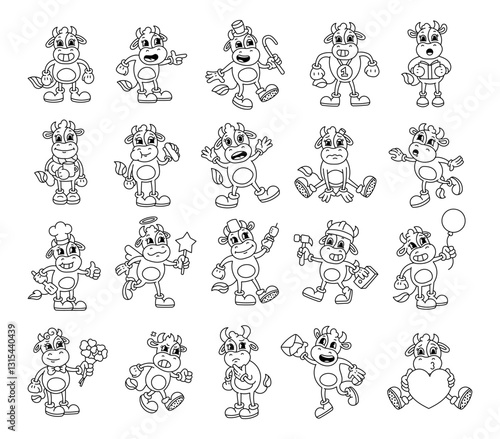 Adorable cow character set featuring various emotions, accessories, playful poses, fun expressions, charming details, and creative elements in a retro groovy cartoon style