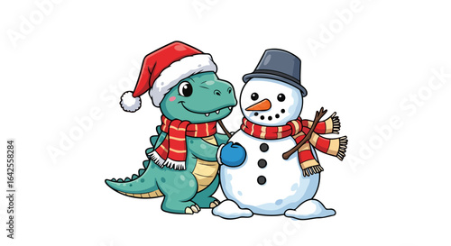 adorable dinosaur and snowman festive winter holiday cheer