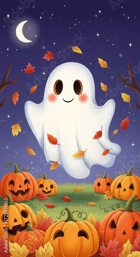Adorable friendly ghost floats among cheerful jack o'lanterns and falling autumn leaves under a starry night sky with a crescent moon