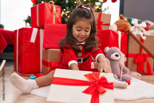 Adorable hispanic girl unpacking gift sitting by christmas tree at home