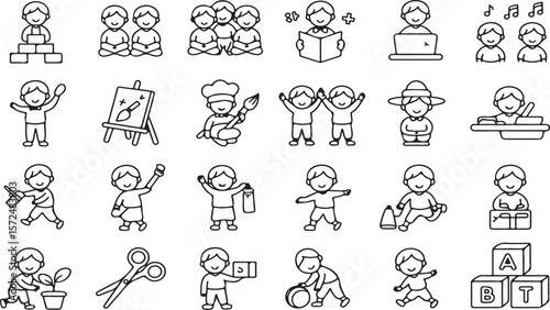Adorable Kids Engaging in Diverse Activities A Collection of Line Art Illustrations