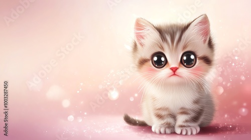 Adorable kitten with big eyes sits against a pink and white bokeh background.