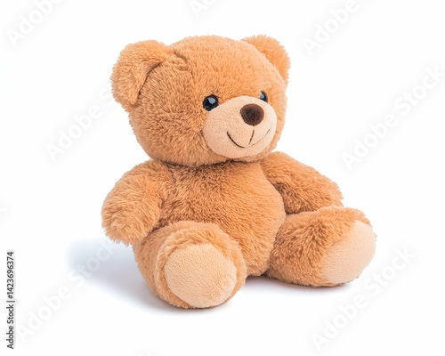 Adorable light brown plush teddy bear sitting on white background