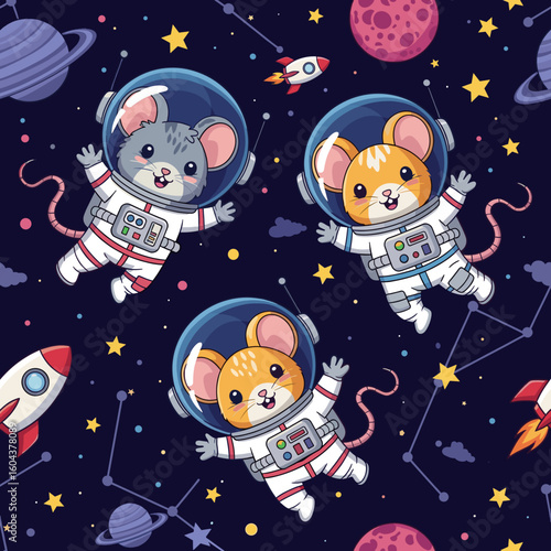 Adorable mice astronauts floating in space, perfect for children's books, textiles, or websites.