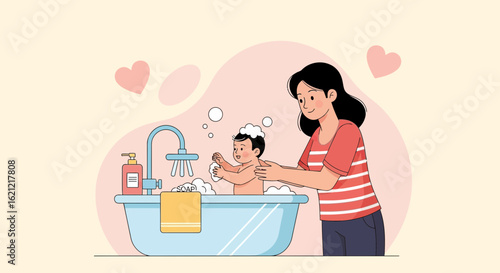 Adorable Mother Giving Her Baby a Bath with Bubbles and Loving Hearts