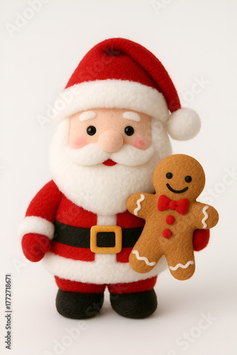 Adorable plush Santa Claus toy holding a gingerbread man, smiling sweetly against a bright white studio backdrop. This jolly holiday figure brings warmth, magic, classic Christmas joy, festive décor
