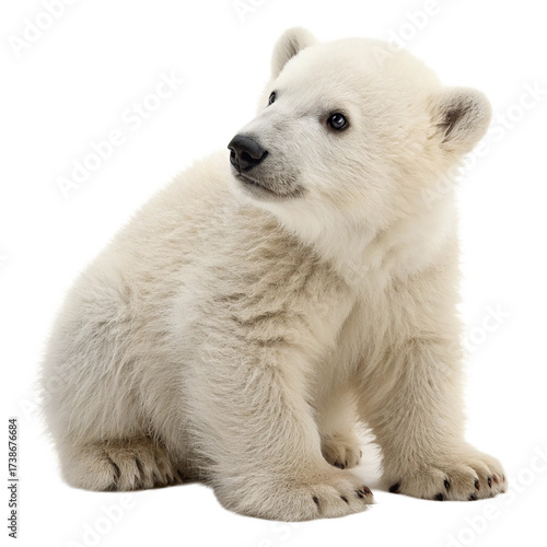 Adorable polar bear cub sitting and looking curiously to the side, perfect for wildlife campaigns