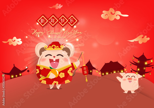 adorable rat and pig in town, celebrate seasonal holiday, Chinese characters mean Happy New Year, cartoon greeting card background vector