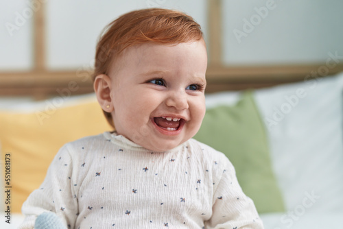 Adorable redhead toddler smiling confident sitting on bed at bedroom