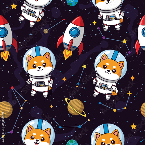 Adorable Shiba Inu astronauts in space: Seamless pattern for kids' apparel, textile designs, and space-themed projects.