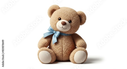 Adorable teddy bear with a blue ribbon, perfect for children's book illustrations, heartwarming greeting cards, or comforting get-well-soon messages, full of soft joy