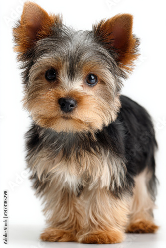 Adorable Yorkshire Terrier puppy standing, facing the camera, against a white background. Its long, silky fur is a mix of brown, black, and tan. : Generative AI