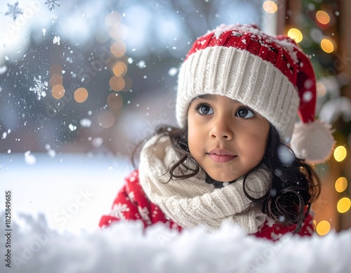 Adorable Young Child in Winter Hat Looking Out at Falling Snowflakes