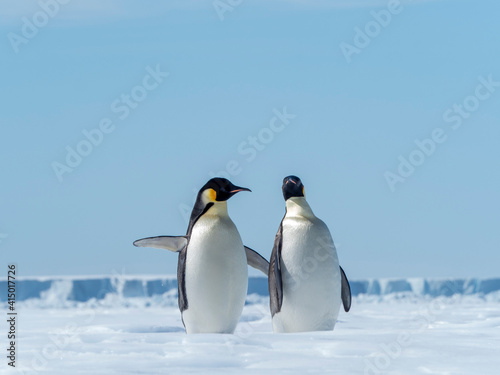 Adult emperor penguins (Aptenodytes forsteri), hauled out on ice near Snow Hill Island, Weddell Sea