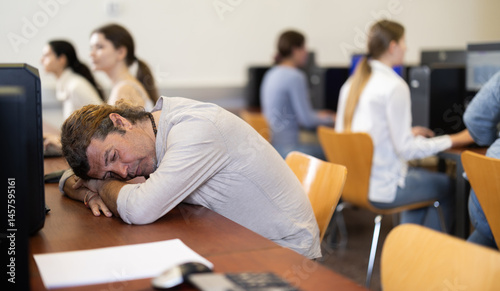 Adult man fell asleep at table while working at computer in office