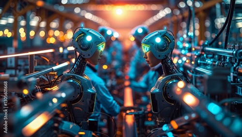 Advanced robots collaborate in a high-tech manufacturing facility during the evening hours