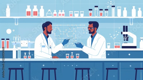Advanced scientific lab, two researchers analyzing chemicals in a flask, discussing findings, medical research, biotechnology, molecular biology