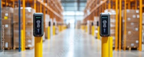 Advanced warehouse with biometric scanners for secure access, futuristic security in logistics