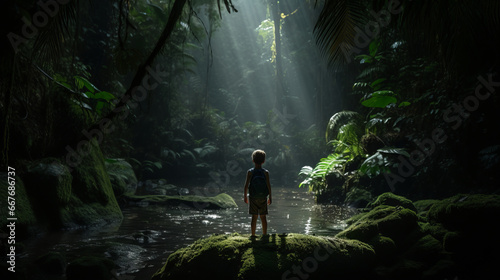 Adventurous boy is exploring unknown forest