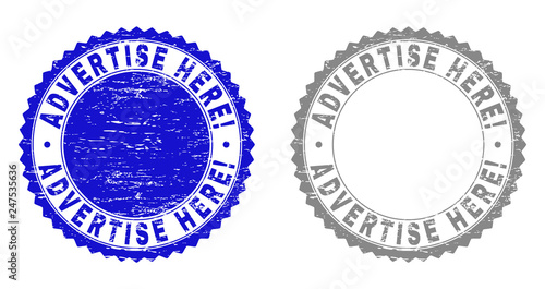 ADVERTISE HERE! stamp seals with distress texture in blue and grey colors isolated on white background. Vector rubber imitation of ADVERTISE HERE! text inside round rosette.