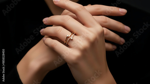 Advertising photo of a woman’s finger wearing a new gold ring with diamond design, showcasing luxury jewelry craftsmanship. Ideal for gold market promotion, branding, and commercial use.