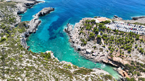 Aerial drone photo of famous snorkeling beach of Porto Limnionas a true paradise with turquoise clear sea and caves forming a blue lagoon, Zakinthos island, Ionian, Greece