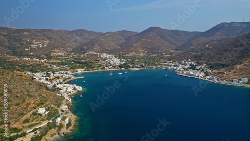 Aerial drone photo of iconic port and picturesque village of Katapola in island of Amorgos, Cyclades, Greece