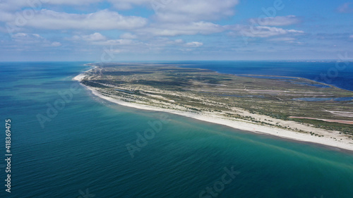 Aerial drone top down photo of seascape of island with sandy beach, turquoise clear waters of black sea in Ukraine and trees on island Dzharilgach.