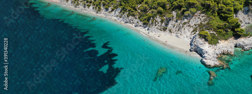 Aerial drone ultra wide panoramic photo of tropical paradise deep turquoise lagoon with beautiful seascape in exotic destination island