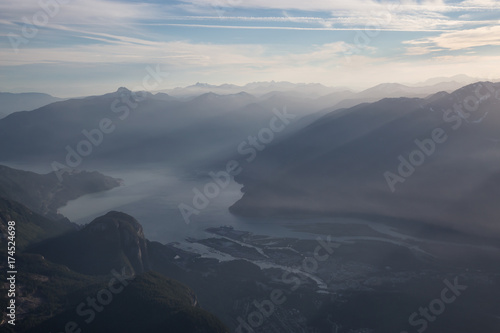 Aerial landscape view of the beautiful mountains near Squamish, North of Vancouver, British Columbia, Canada.