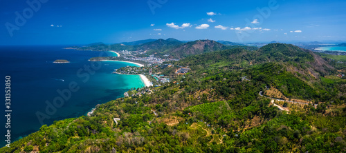Aerial panorama of the coastline of the island of Phuket with tropical sandy beaches and green mountains. Thailand