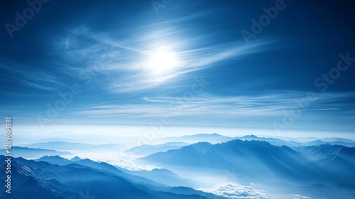 Aerial panoramic view of tropical mountains covered in lush greenery with mist and fog in the distance, under a vast blue sky with scattered white clouds, creating a serene and breathtaking landscape.