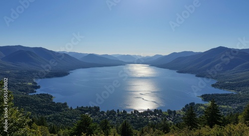 Aerial perspective of a large lake surrounded by mountains on a bright sunny day, with a clear blue sky