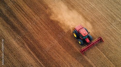 Aerial perspective of a red tractor cultivating an expansive golden wheat field during harvesting season showcasing modern farming techniques