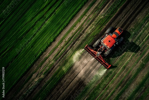 Aerial perspective of tractor applying pesticides with field sprayer in action. Concept Agricultural Machinery, Pesticide Spraying, Aerial Photography
