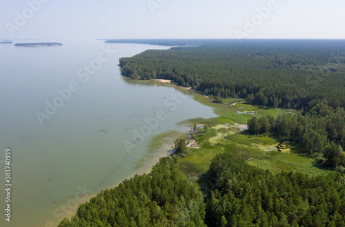 Aerial photo of forest boggy lake in the Karakansky pine forest near the shore of the Ob reservoir.