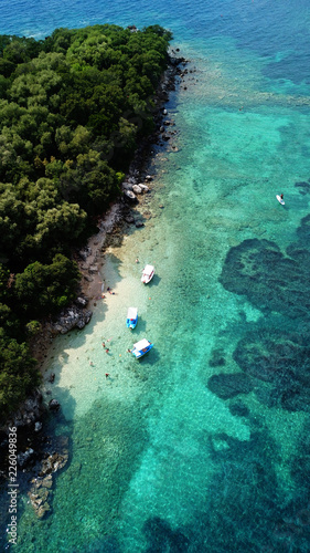 Aerial photo of iconic white cliff tropical bay forming a blue lagoon with deep turquoise clear ocean and docked small boats enjoying this unique paradise