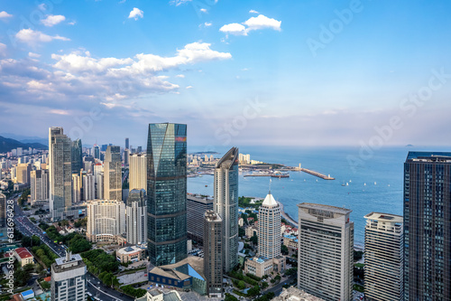 Aerial photography of modern architecture along the urban coastline of Qingdao