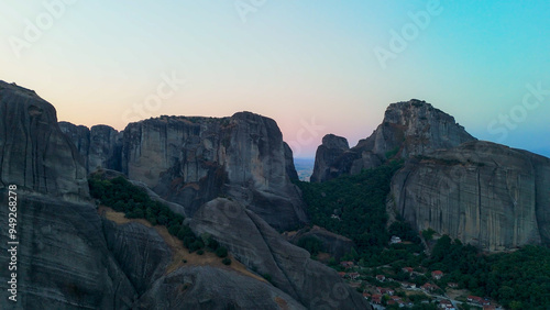 Aerial shot of monasteries built on unique rock formations in the Meteora region of Greece