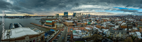 Aerial skyline view of Fells Point and Downtown Baltimore Maryland on a winter afternoon