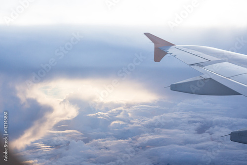 aerial top view from air plane flight high space with clear white cumulus cloud and cloudscape on blue sky