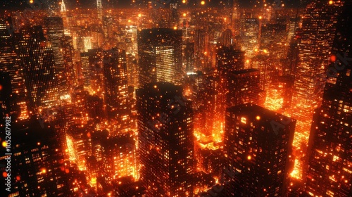 Aerial view of a city at night with glowing lights, fire and abstract.
