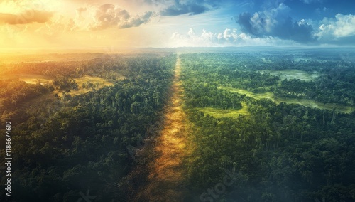 Aerial view of a forest divided by a path, with a dramatic sunset and sunrise sky.
