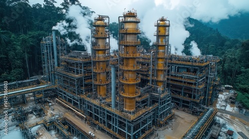 Aerial View of a Massive Industrial Complex Surrounded by Lush Green Forest