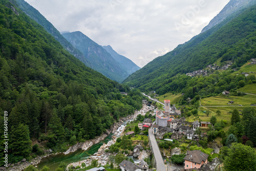 Aerial view of a quaint village nestling between verdant mountains and a rocky riverbed, Lavertezzo, Ticino, Switzerland.