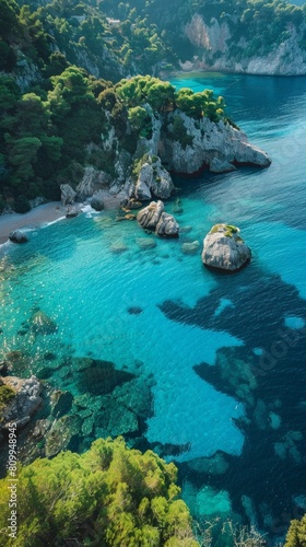Aerial view of a secluded cove with crystal-clear turquoise water, fringed by lush greenery and dramatic cliffs