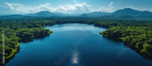 Aerial view of a serene lake surrounded by lush green forest and distant mountains under a blue sky with scattered clouds Copy Space