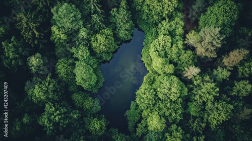 Aerial View of a Serene Pond Surrounded by Lush Green Trees in Nature